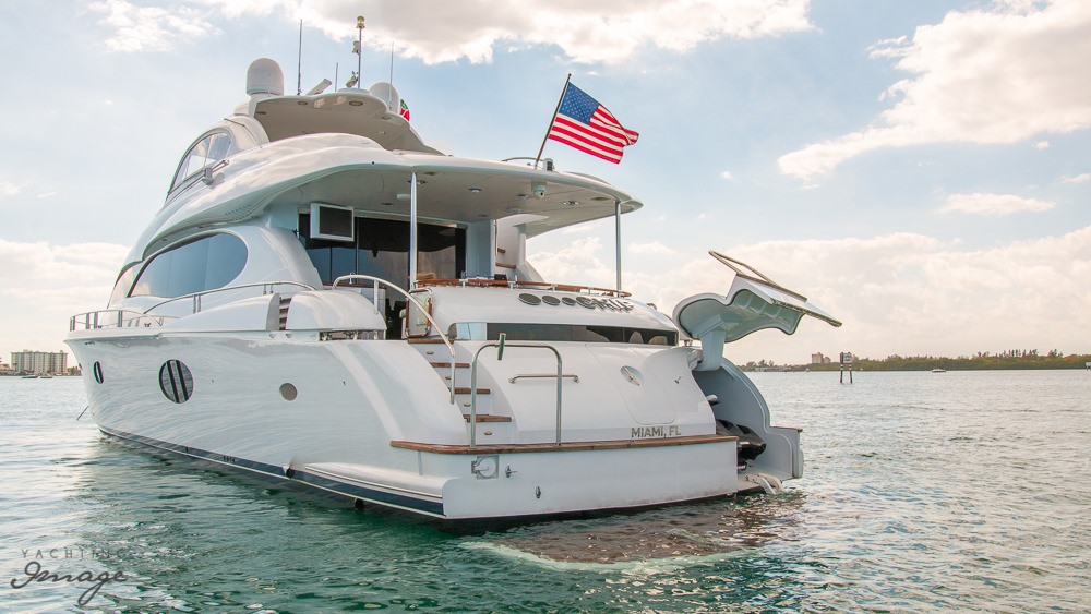 The 84’ Lazzara is a great choice for traveling the South Florida waterways in style. The yacht has a spacious interior layout and flybridge. The main deck interior layout consists of a full beam width salon with separate dining area, a large galley forward with country kitchen style dining area, a day head, and a lower helm for inclement weather. Sliding glass doors lead from the salon to the spacious aft deck.