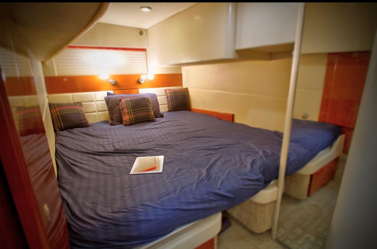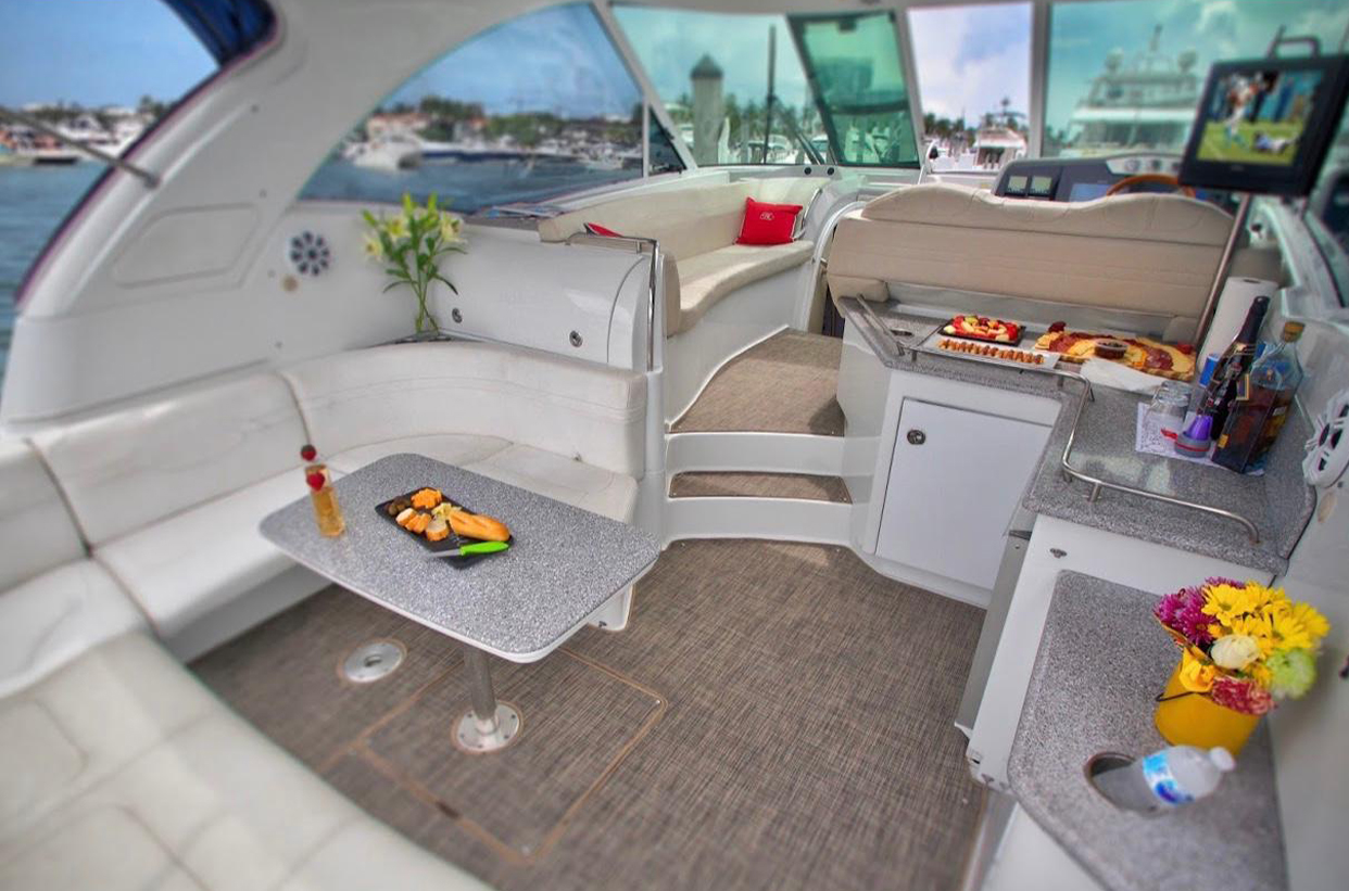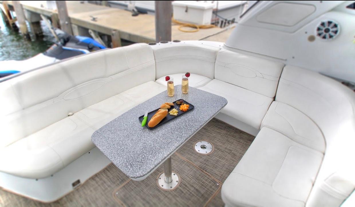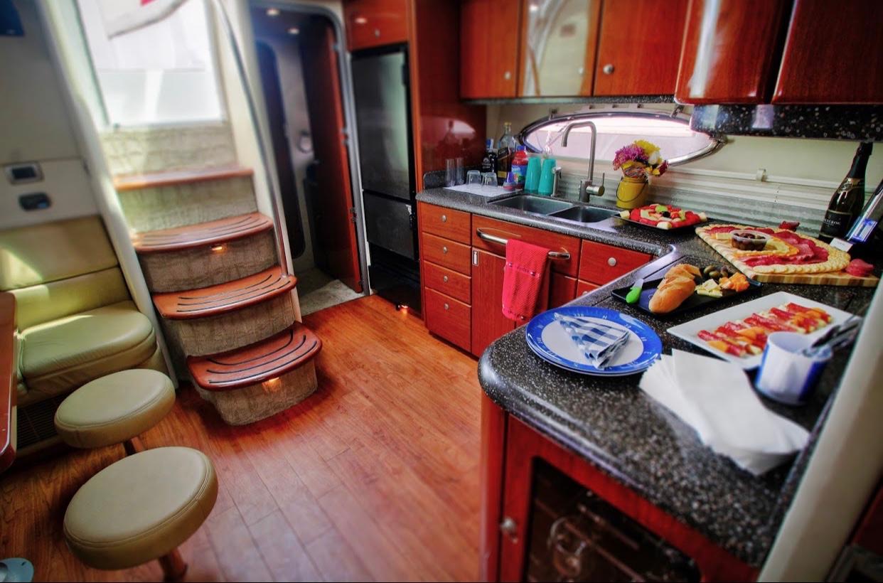 Our 48ft Vessel awaits you. Unwind or unravel and indulge your leisure time, our interior cabin features two bedrooms, two bathrooms, a dining sectional and a kitchen that includes a stove and a microwave. Need Apple® TV? You can watch it here.