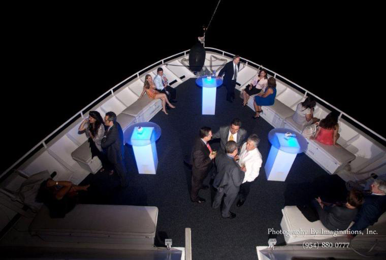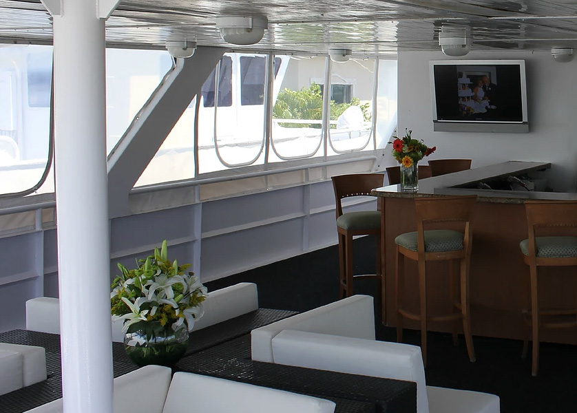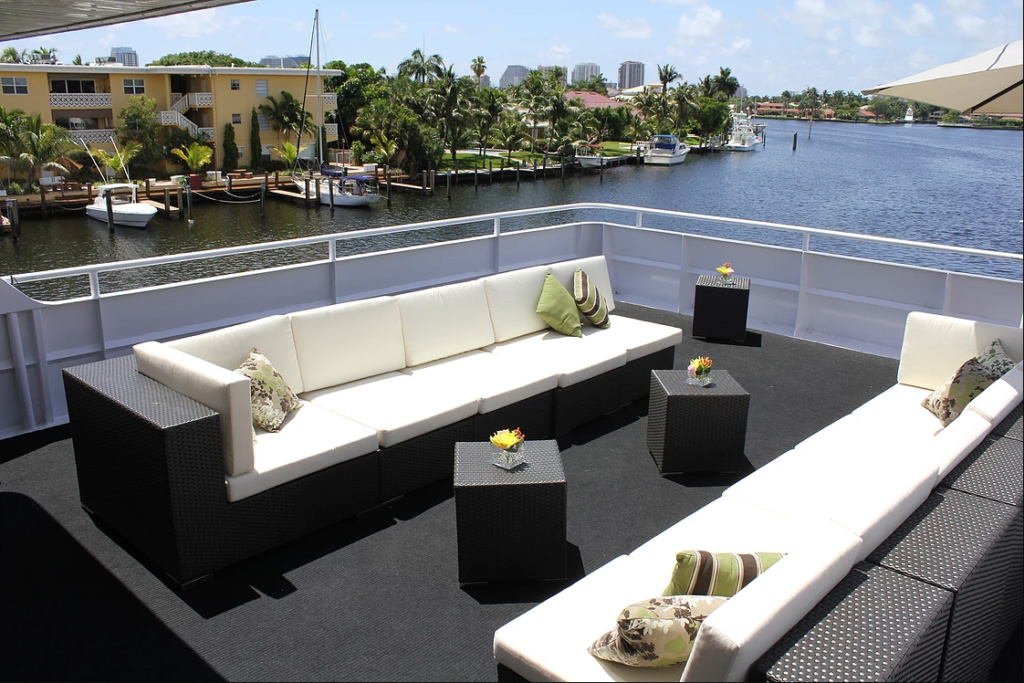 This mega-yacht also boasts a partially enclosed top deck with full bar, private stateroom, and an additional outdoor dance floor area, all surrounded by a state-of-the-art sound system.