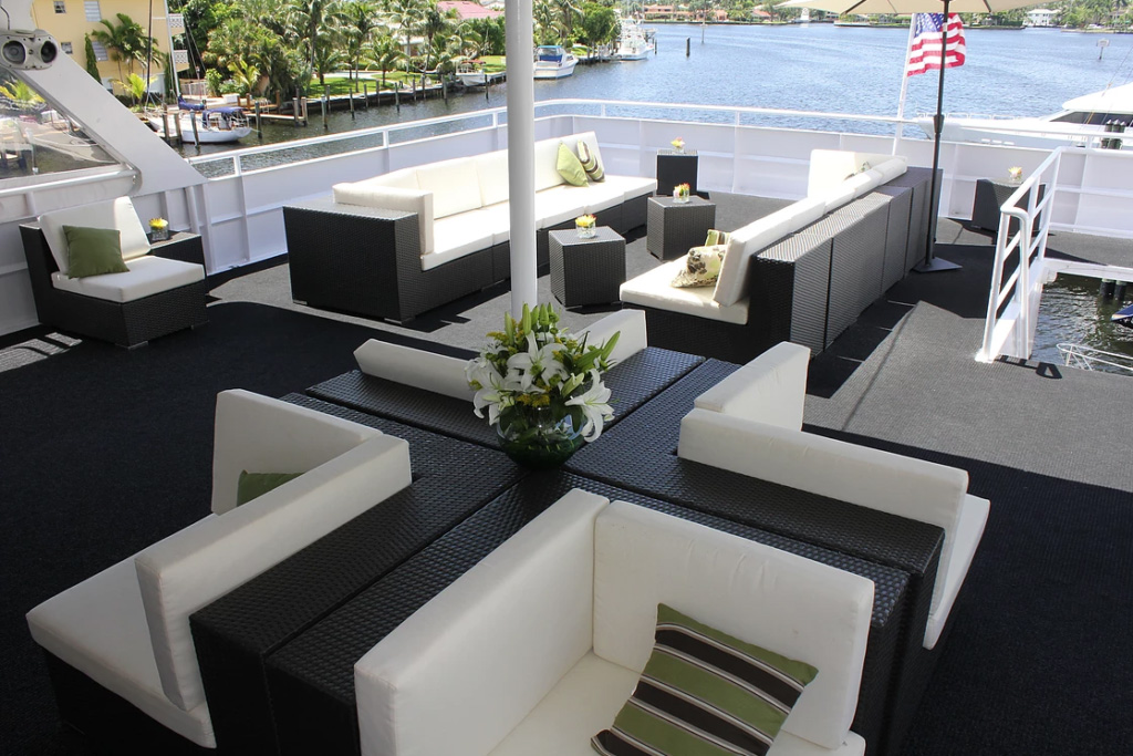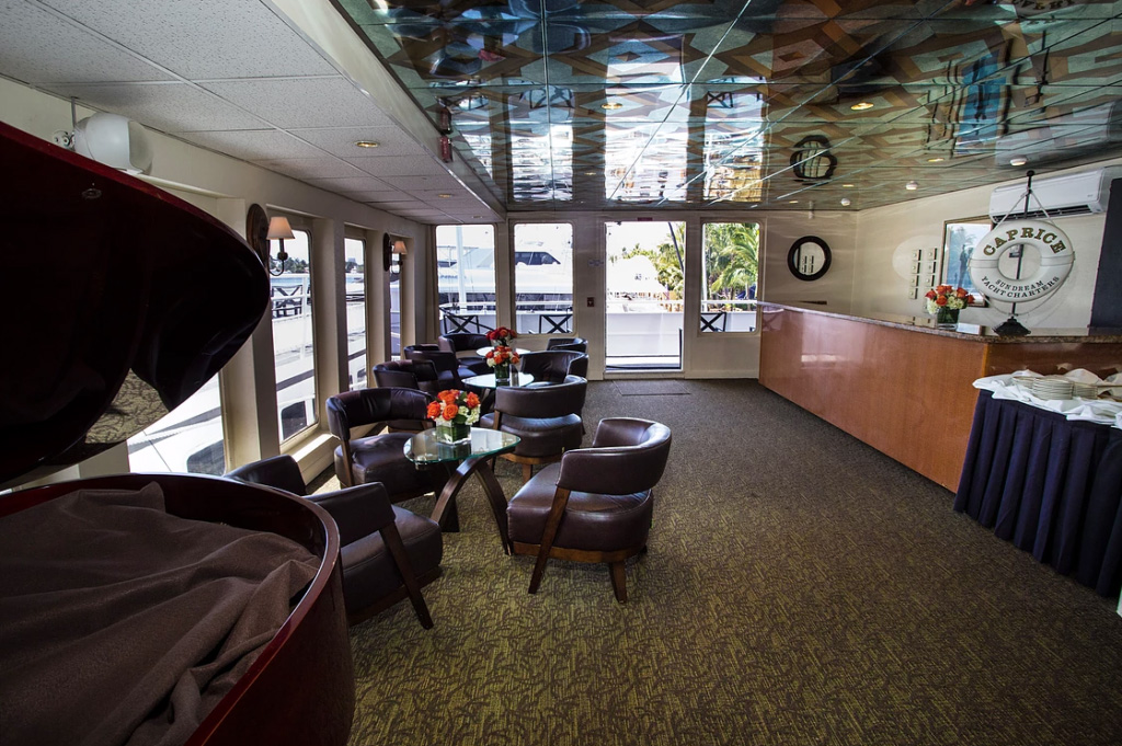 The Caprice can accommodate from 100 to 400 guests, this custom built 130 ft mega-yacht is the perfect venue for all major events. Caprice accommodates up to 160 guests for a sit down dinner, where the entire first deck area is available for dining services. It’s extravagant five-foot bay windows, custom-made copper ceilings and 1,700 square-foot main salon with custom bar, baby grand piano and comfortable furniture groupings, just adds to the charm.